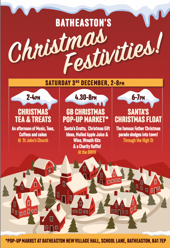 4.30-8pm - Grow Batheaston Christmas Pop Up Market in the New Village Hall - over 20 stall holders. Mulled apple juice, wine, and cider