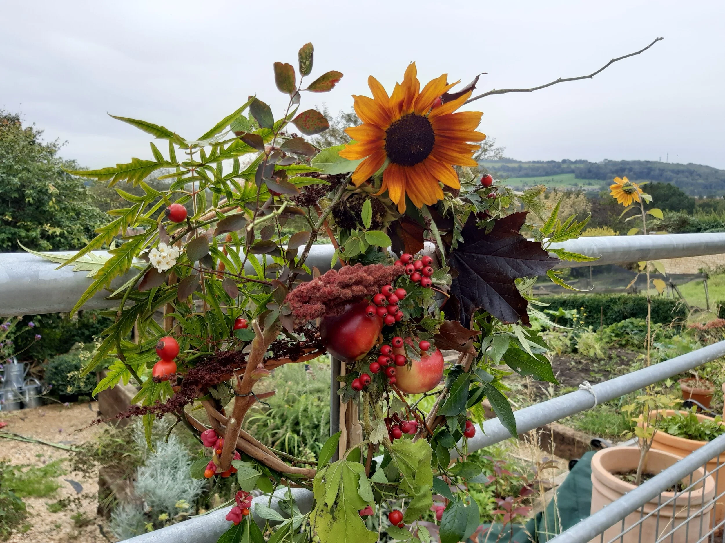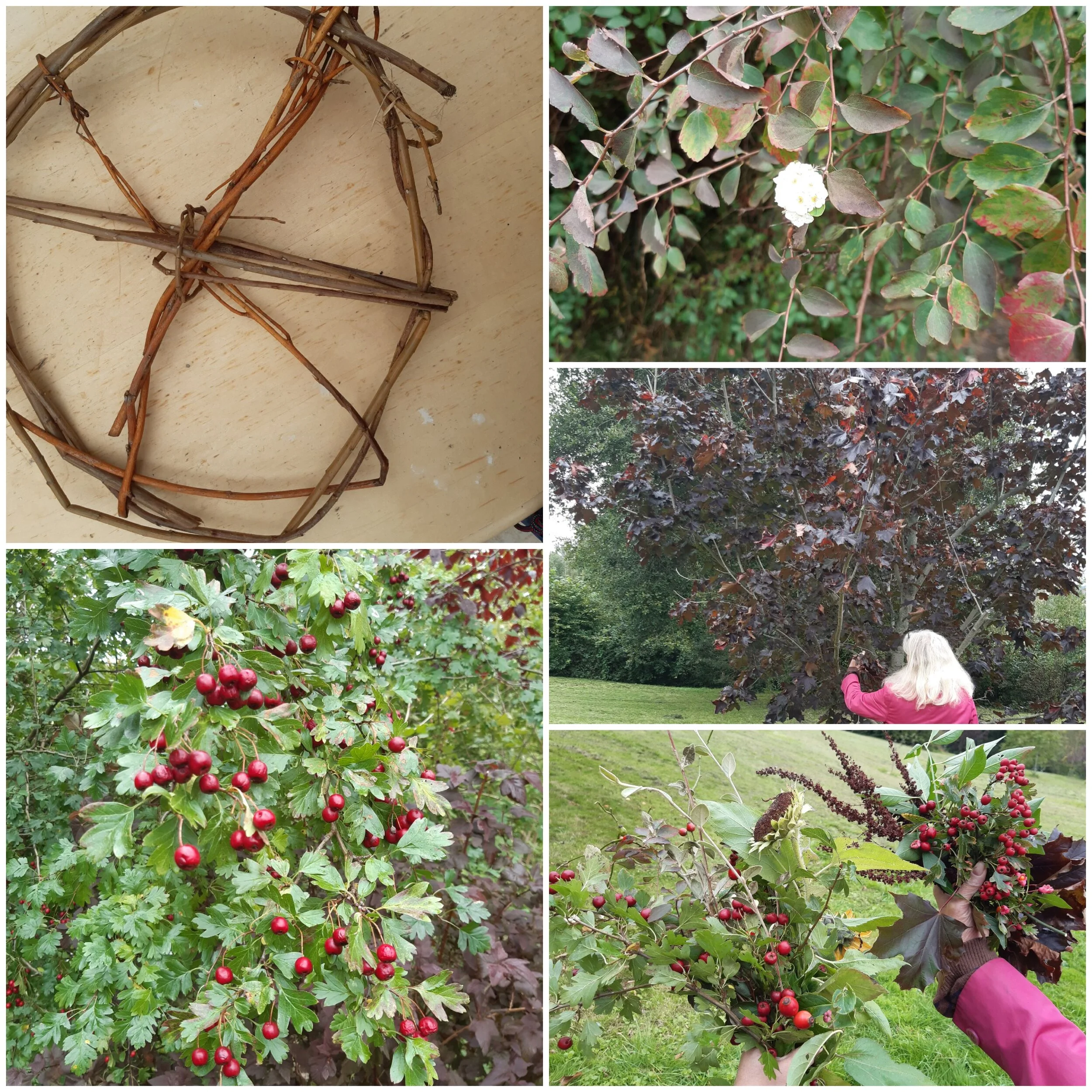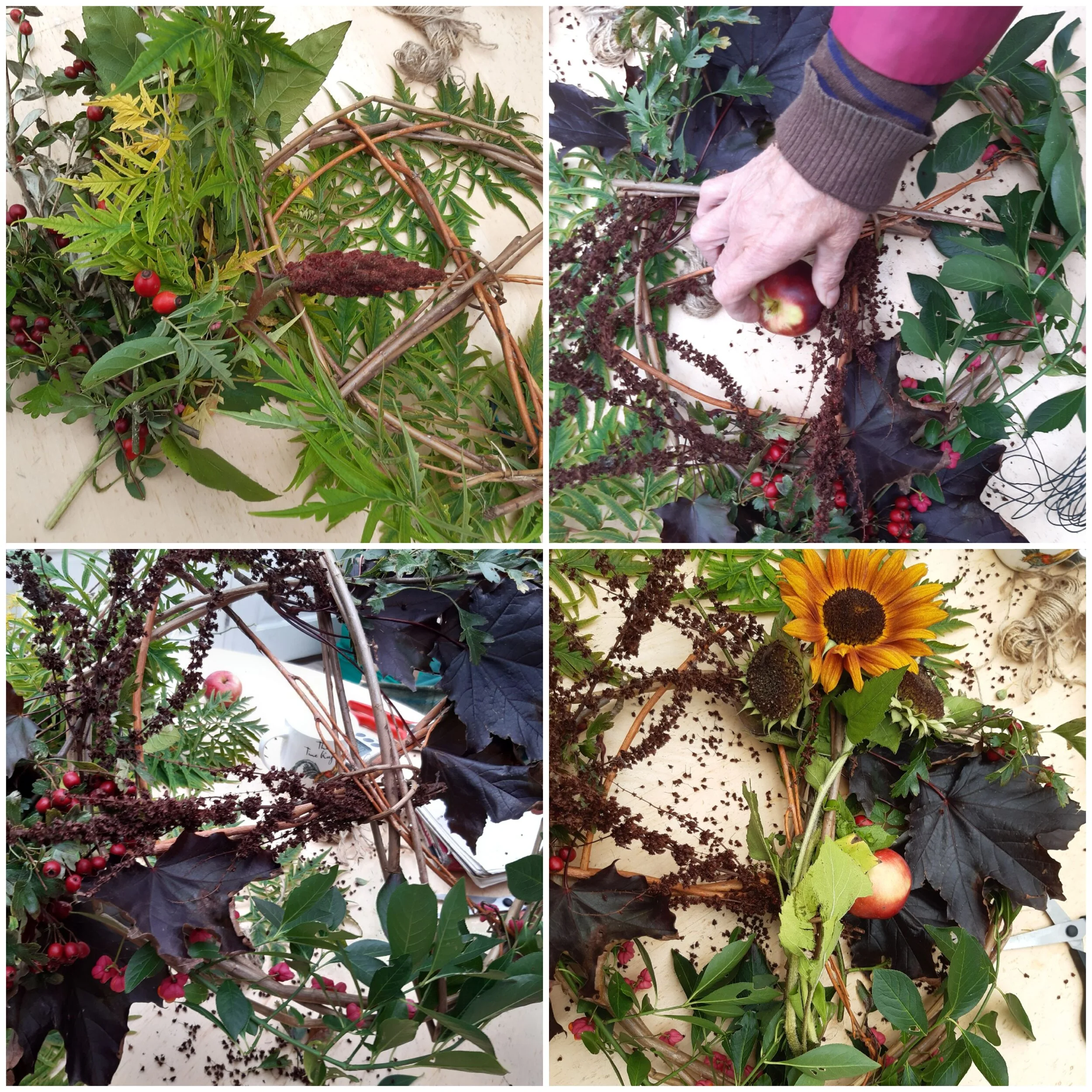 During a quick forage in the garden we found beautifully coloured and evergreen leaves, bright berries and unusual seed pods. These were then arranged on and then woven into a premade willow circular base, but any bendy twigs can be used, then secured with thin wire.